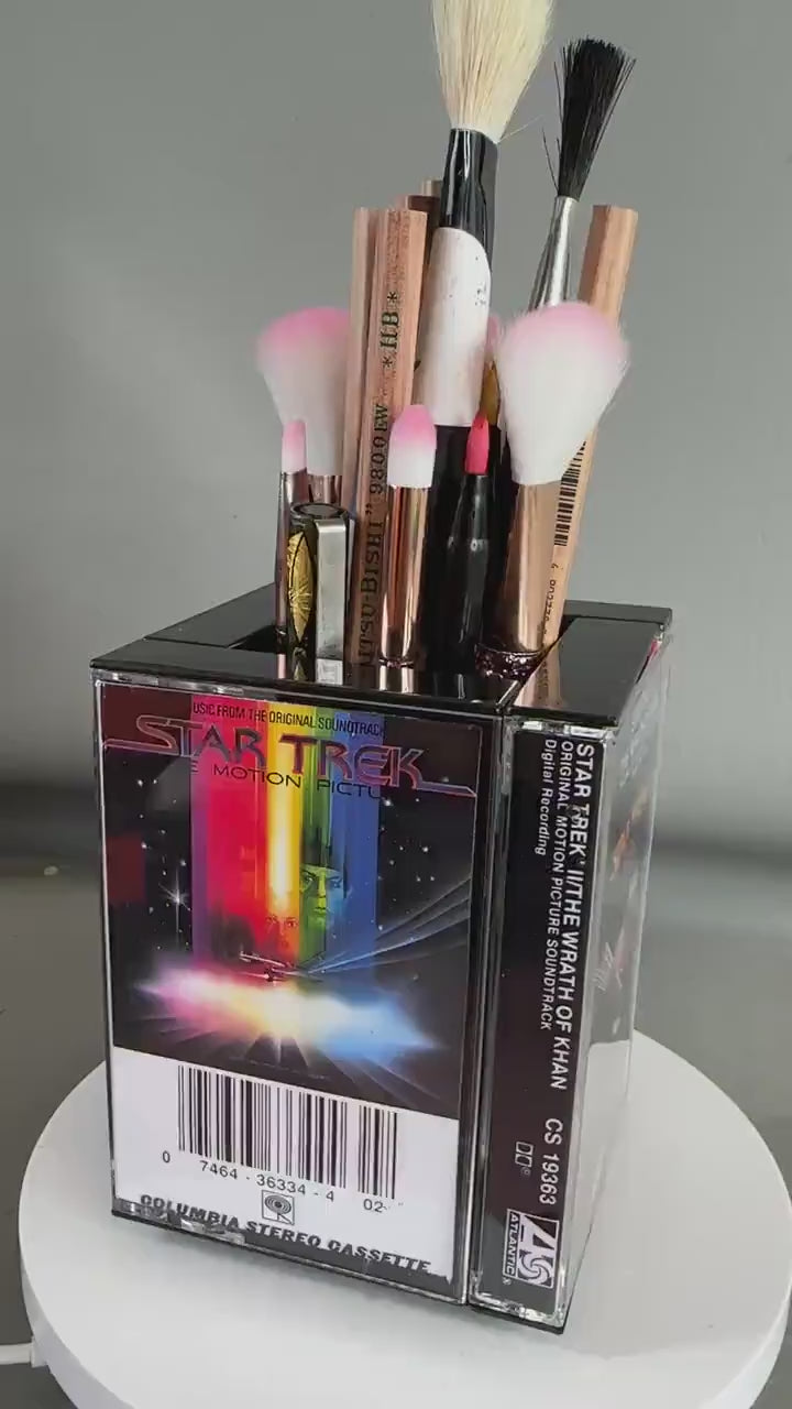 This custom-crafted desk organizer, made from real plastic cassette cases.